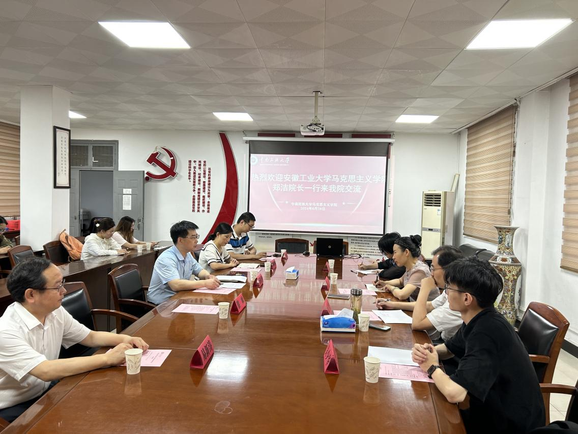 6月28日上午,安徽工业大学马克思主义学院院长郑洁及该院教师陆书建、王凌云、吴少华一行4人来我院调研交流。院党委书记汤振华、副院长瞿晓琳接待了郑洁一行并与来宾举行座谈。我院“习近平新时代中国特色社会主义思想概论”教研室主任易新涛教授、辅导员陈玮龙及部分学生代表参加座谈。座谈会由瞿晓琳主持。