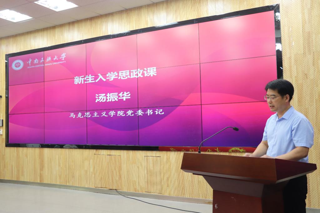 院党委书记汤振华为新生讲授入学首堂思政课。他从暑假爆火的网络游戏“黑神话:悟空”谈起,激励同学们要以积极心态面对一切、阳光自信开启大学新征程:一是做一颗牛油果,练就强大内心,保持包容与温暖;二是做一个橡皮球,拥有强大的抗压能力以应对未来的各种风险挑战;三是做一棵骆驼刺,努力向下扎根丰富自我;四是做一株向日葵,永远心怀阳光、一往无前;五是做一块吸铁石,接受现在,憧憬未来,吸引彼此共同努力。“人生其实就是一场马拉松,它要比的永远不是谁跑在最前面,而是谁坚持到最后”,他最后勉励新同学们踔厉奋发、砥砺前行、乘风破浪、未来可期。