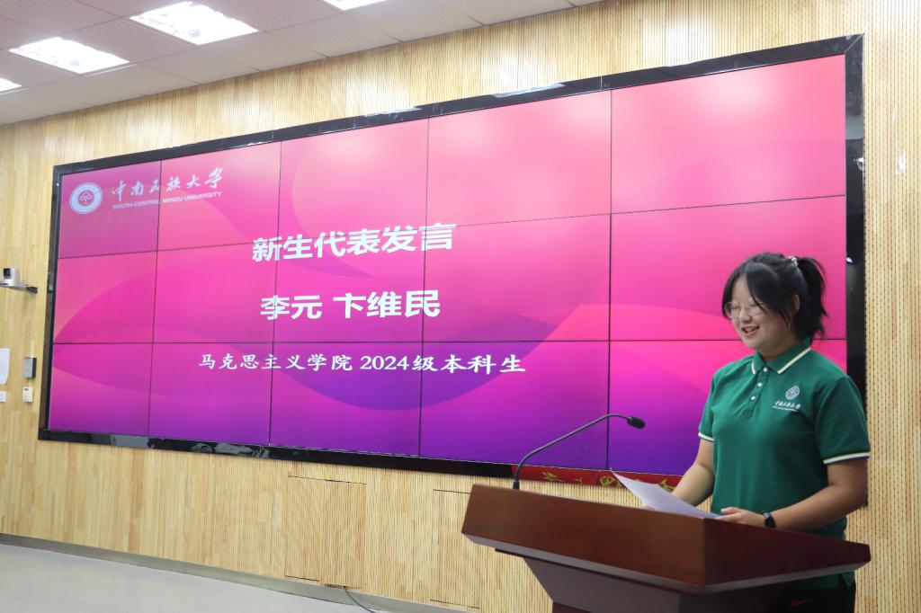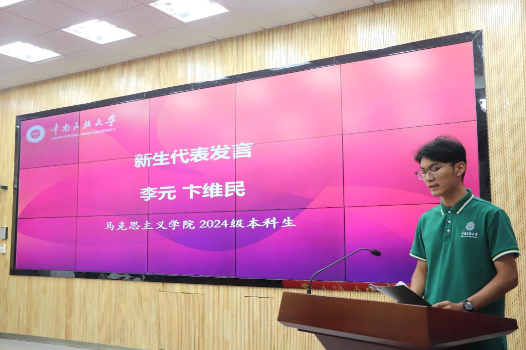 2024级本科生李元、卞维民分别代表新生作了发言。李元就如何充实度过四年大学生活提出了自己的建议:一是尽快调整状态来适应新生活,二是树立明确的目标,三是不忘初心、接好新时代的接力棒。卞维民分享了自己对学校、学院的初印象,认为新时代的马院人应该努力做立大志、明大德、成大才、担大任的新时代好青年。