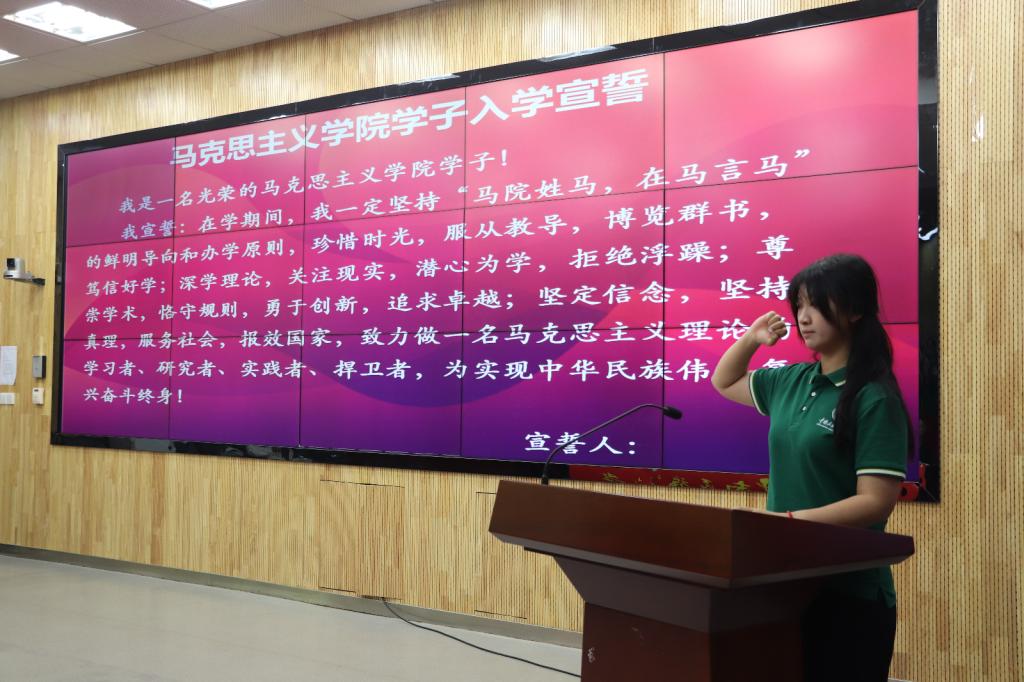 全体新生在2024级本科生蒋子欣的带领下进行了入学宣誓。同学们集体宣读了“马院姓马,在马言马”的铿锵誓言,立志成为马克思主义理论的学习者、研究者、实践者、传播者、捍卫者,为实现中华民族伟大复兴奋斗终身。