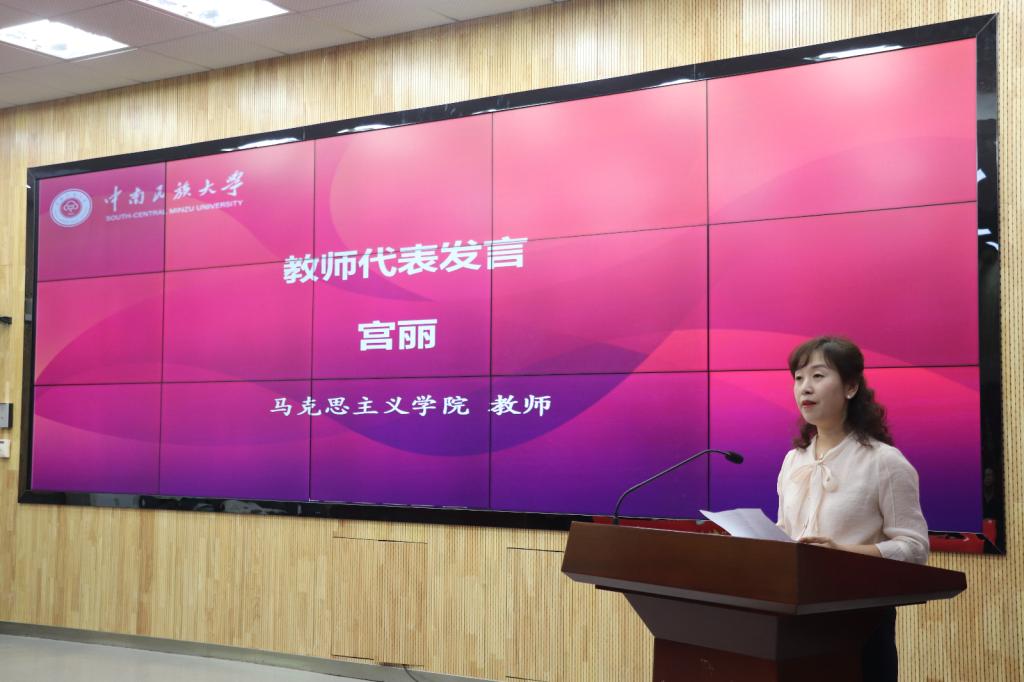 宫丽副教授作为教师代表作了发言,与大家共同探讨了如何成为一个真正的马院人。她指出,首先要有心怀家国的胸怀,勇于担当时代使命;其次要有潜心治学的品格,提升自身综合素质。最后,宫丽老师表达了对同学们的期待与勉励,希望大家努力学习专业知识,为推动中国式现代化、实现中华民族的伟大复兴贡献青春力量。