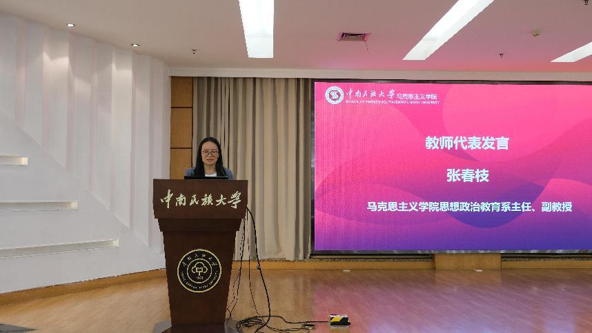 张春枝副教授作为教师代表作了发言。她提出,同学们应当深读经典,筑牢思想根基;立足现实,勇担社会责任;在增进共同性、尊重和包容差异性中培养宽广胸怀。她强调,学习马克思主义是一场修行,同学们要在求知中找准精神坐标,努力成长为有思想、有温度、有责任、有胸怀的马院人。