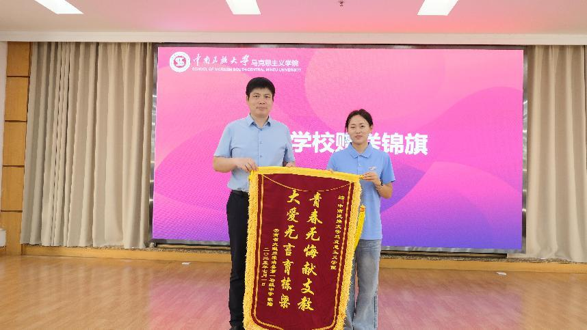 学校研究生支教团成员、我院2025级硕士生丁玉杰代表支教学校,向学院赠送了锦旗。黎海波代表学院接收锦旗。他充分肯定了这面锦旗的重要意义,并勉励全体同学积极参加社会服务,实现人生价值,助力提升学院、学校社会影响力。