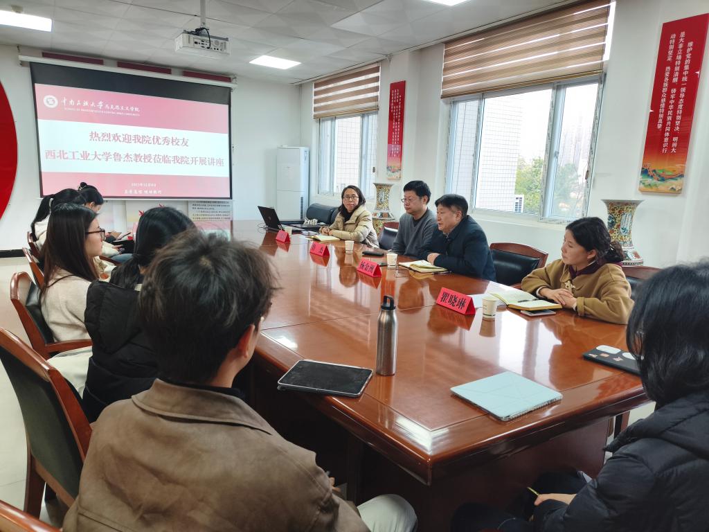 12月8日,我院杰出院友,西北工业大学长聘教授、博士生导师鲁杰应邀回校考察,并以“思想政治教育传播学的理论进路与实践面向”为题,为我院师生带来一场学术讲座。院党委副书记李建青及学院师生代表30余人参加讲座。讲座由副院长瞿晓琳主持。