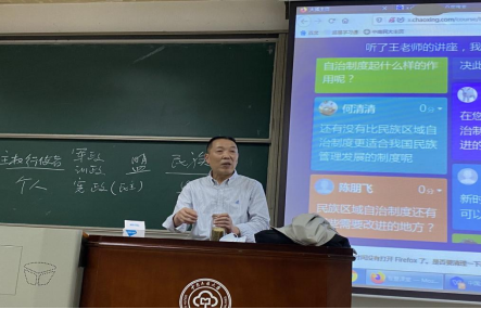 王奎正教授分别从“民族区域自治制度”形成的历史背景、中国共产党对新中国建设形式的探索、正确认识民族区域自治制度以及坚持和完善民族区域自治制度四个方面展开讲解。主要概述了党在百年历史征程中领导的民族区域自治制度变革、发展的阶段特征,梳理总结党用民族区域自治制度为解决中国的民族问题所做出的重大历史性贡献,带领同学们理清民族区域自治制度形成、发展的历史脉络,增强实现中华民族伟大复兴历史任务的信心和决心。最后,王奎正教授以习近平总书记“九个铭记”作为此次分享的结尾,并对我们年轻人应当如何在国家发展的新阶段为实现中华民族的繁荣富强提出期望,勉励当代青年肩负起时代重任,努力学习,树立正确的世界观、人生观和价值观,为实现国家富强、人民幸福、人类大同贡献自己的一份力量。王奎正教授还就同学们关于民族区域自治制度的作用、制度完善等主题进行了互动。