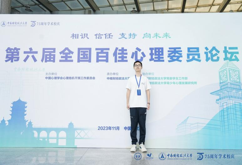 11月1日至3日,第十八届全国高校心理委员工作研讨会暨朋辈辅导论坛于中南财经政法大学顺利召开,来自国内外知名高校、研究机构的专家学者以及北京大学、复旦大学、中国科学技术大学等260多所高校的心理委员近900余人参加本次论坛,央视网等主流媒体对研讨会进行了报道。这次论坛上,经中国心理学会心理危机干预工作委员会、全国高校心理委员工作协作组相关专家评审,我院2022级硕士研究生祝宇豪被授予“全国百佳心理委员”荣誉称号。