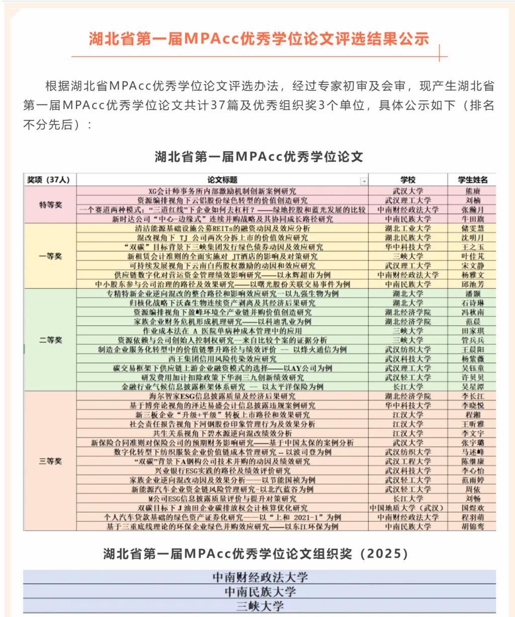 近日,湖北省会计硕士专业学位联盟公布首届MPAcc优秀学位论文评选结果。我院在本次评选中表现突出,获得特等奖、一等奖、三等奖各1项,同时荣获“优秀学位论文组织奖”,这一成绩体现了我院以高质量人才培养为核心,在科研引领、行业协同、实践育人等环节的系统推进。