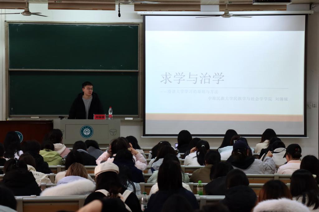 讲座中,刘锡钺老师围绕“治学与人格”“求学与‘成功’”“读书与选题”三个主题,结合自身多年学术积累与育人经验,与同学们进行了深入交流。他指出,治学根本在于立德,善良与正直是做学问的基础;民族研究的意义在于增进理解与和谐,彰显人文学科的现实关怀。