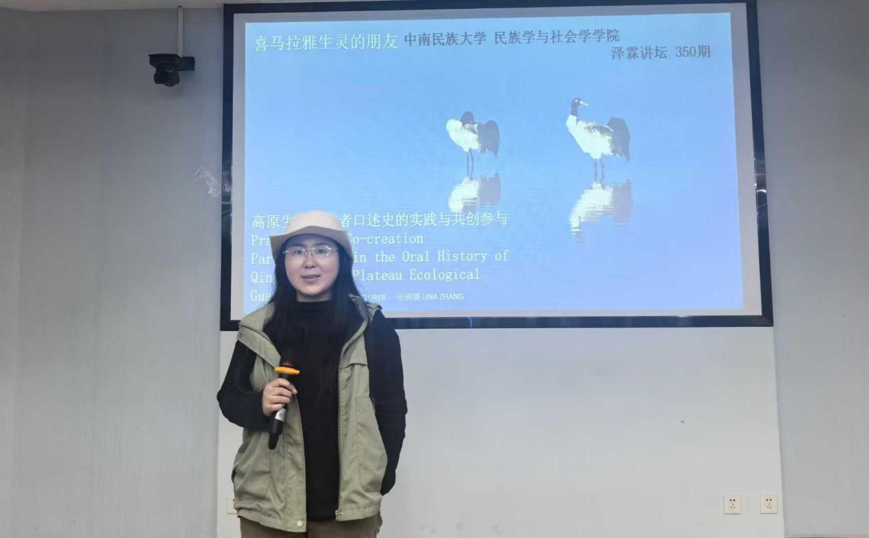 10月27日晚,喜马拉雅生灵的朋友自然影像创始人、自然纪录片导演、制片人张丽娜女士应邀参加泽霖讲坛,在学院八角楼报告厅开展题为“高原生态守护者口述史的实践与共创参与”的专题讲座。讲座由民族学系主任刘丽娜老师主持,马宁、齐子通、王艳萍等老师及学院各专业同学参加了讲座。