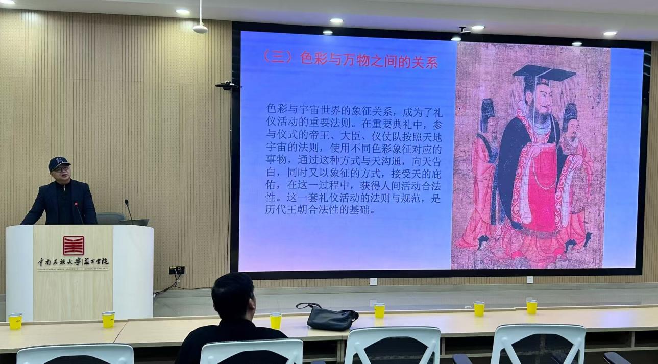 讲座开始后,肖世孟教授向在场的师生提出了一个重要问题:专业研究该如何响应国家需求、填平与国家需求间的沟壑,作为视觉元素的色彩,又该如何锚定国家需求、赋能文化战略,并围绕这一问题从三个层面展开,为在场师生带来一场关于色彩研究的深度学术分享。
