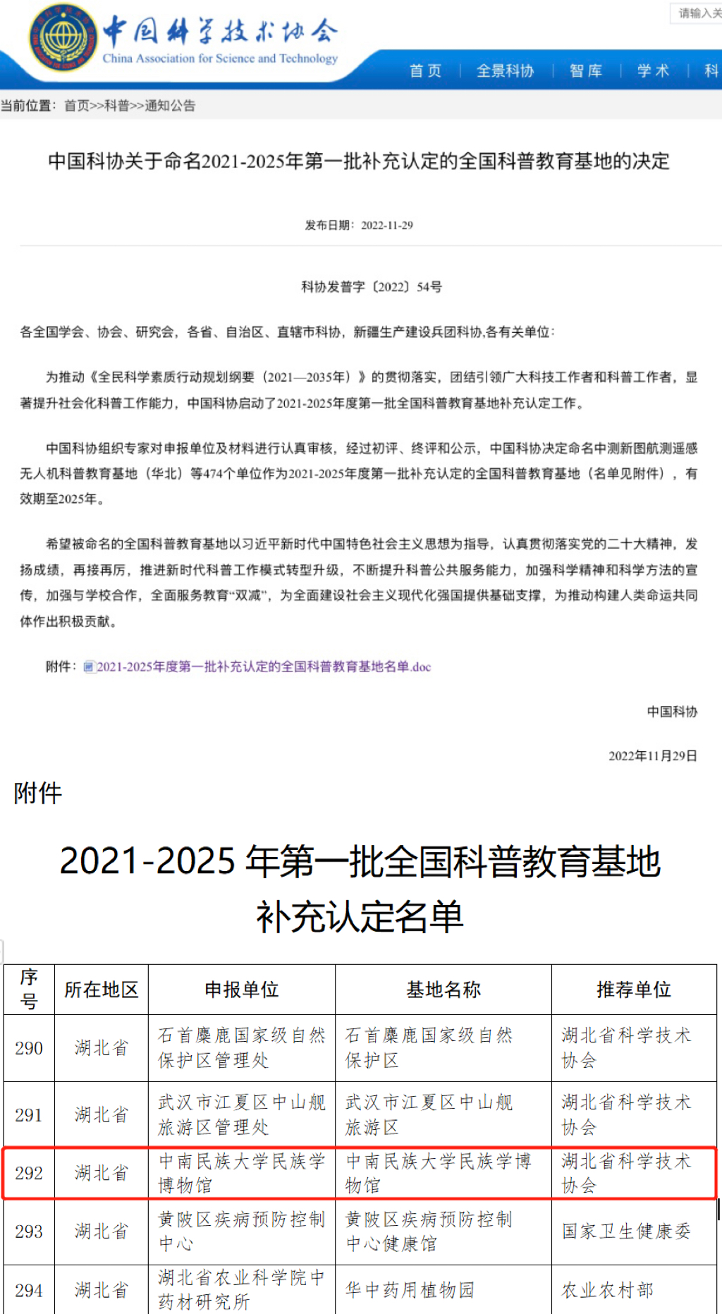 11月29日,中国科学技术协会官网公布《2021-2025年第一批补充认定的全国科普教育基地名单》,补充认定了474家单位为2021-2025年第一批全国科普教育基地。其中,湖北省18家单位入选,威尼斯886699民族学博物馆位列其中。