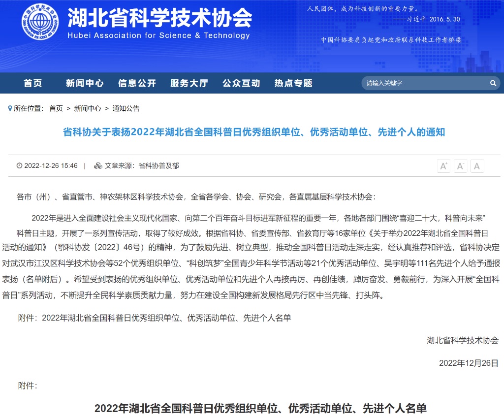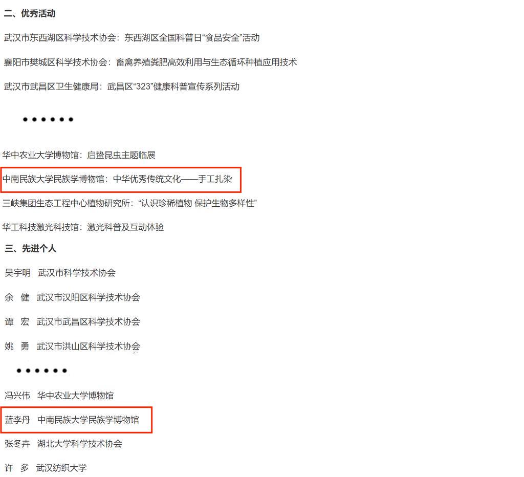 12月26日,湖北省科协公布了2022年湖北省全国科普日优秀组织单位、优秀活动单位和先进个人名单,我馆开展“中华优秀传统文化——手工扎染”社教活动被评选为“优秀活动单位”,蓝李丹老师获评“先进个人”。
