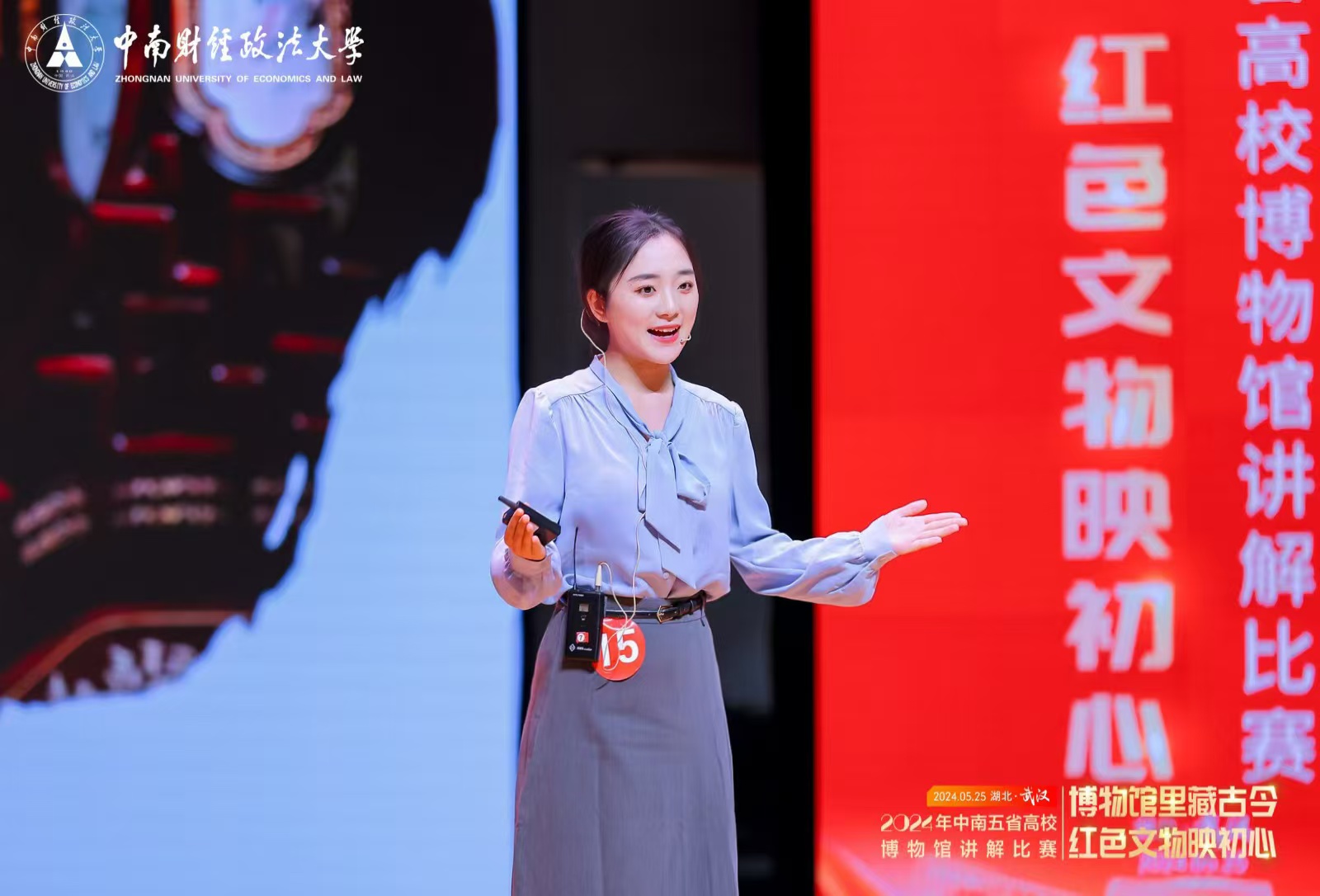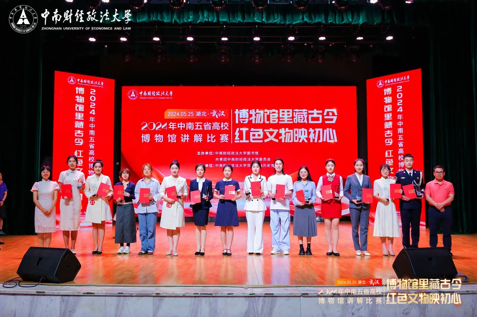 2024年5月25日,中南五省高校博物馆讲解大赛总决赛在中南财经政法大学南湖校区艺体文艺中心进行,来自湖北、湖南、广东、河南、江西中南五省高校博物馆、校史馆的30名选手围绕“博物馆里藏古今,红色文物映初心”主题,为现场观众带来一场精彩纷呈的博物盛宴。我馆志愿者泽让初在决赛中荣获三等奖。