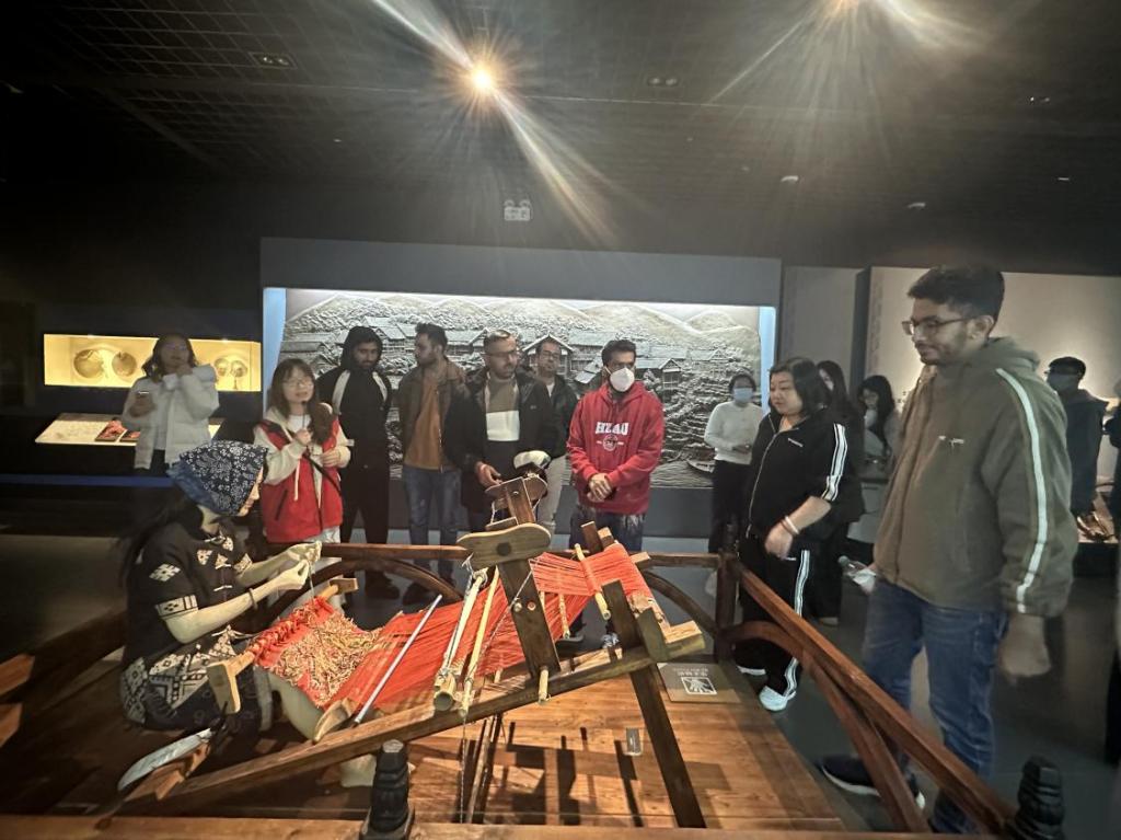 活动伊始,我馆讲解员围绕“纺织与造物智慧”主题,聚焦中国古代织机、各民族传统服饰及印染工具等核心展品,为国际访客与社区居民生动讲述了中国纺织技艺的源流演变与文化意蕴。面对精美的民族服饰,中外来宾表现出浓厚兴趣,频频与讲解员交流互动,现场气氛活跃热烈。