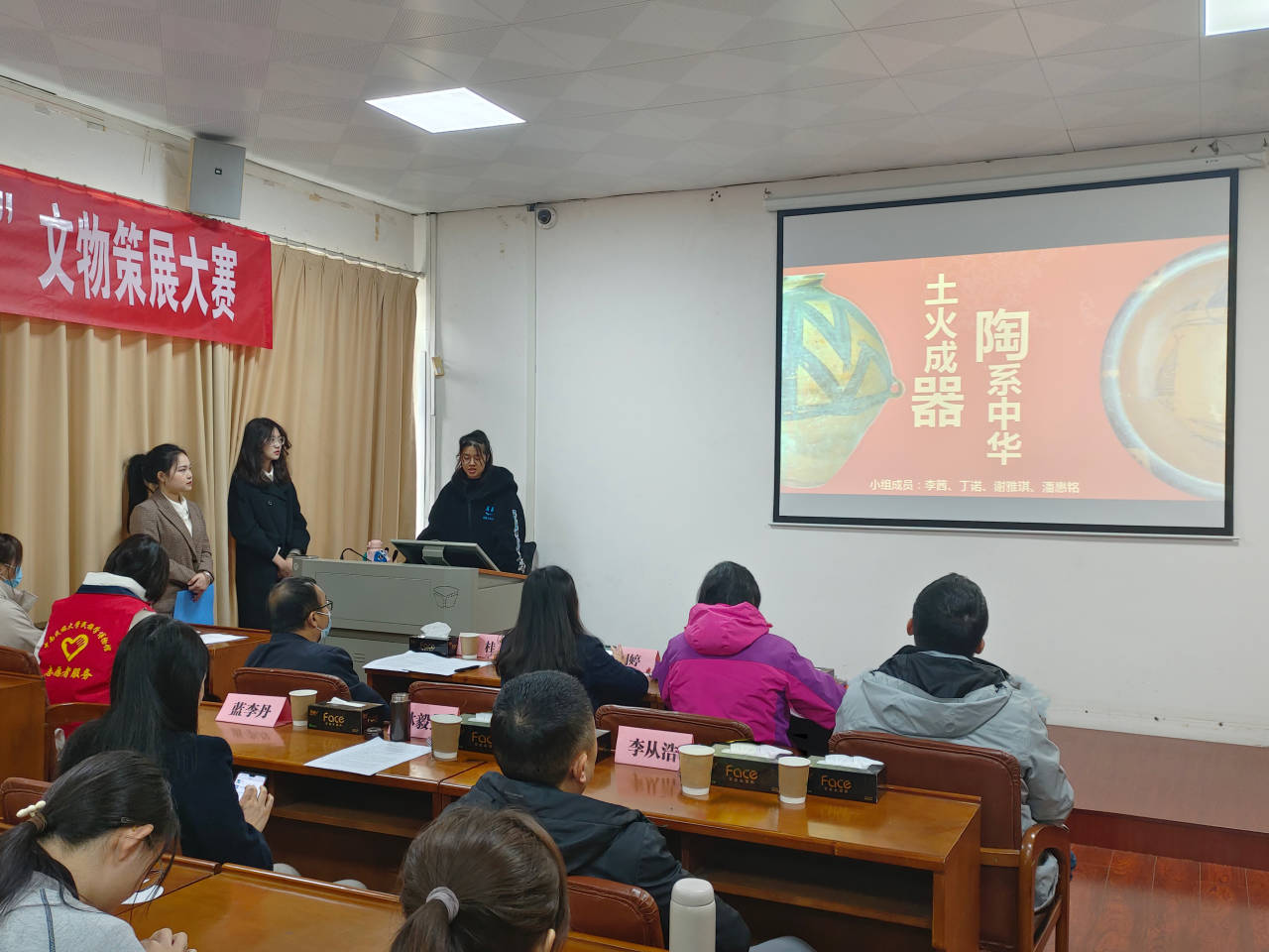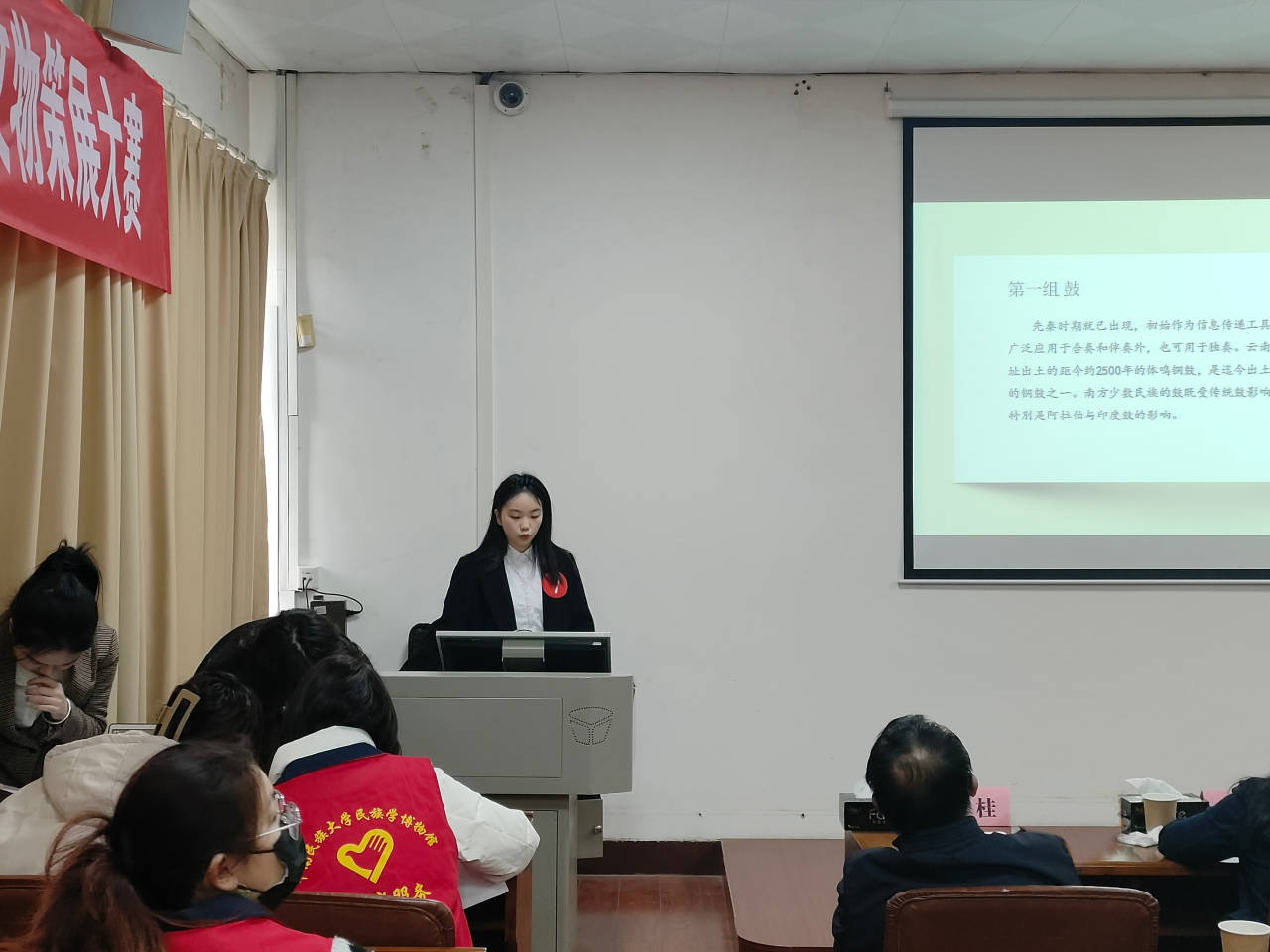 此次比赛邀请到的嘉宾有民社院党委书记李从浩书记,民族学博物馆副馆长林毅红。由民族学博物馆藏品部主任王瑞莲、民族学与社会学学院文物与博物馆学专业教研室主任高晶晶、民族学博物馆研究部主任陈桂、民族学博物馆藏品部刘婷四位老师担任大赛评委。李从浩书记为策展大赛开场致辞,四位评委分别作了精彩点评,现场同学们深受启发,受益匪浅。