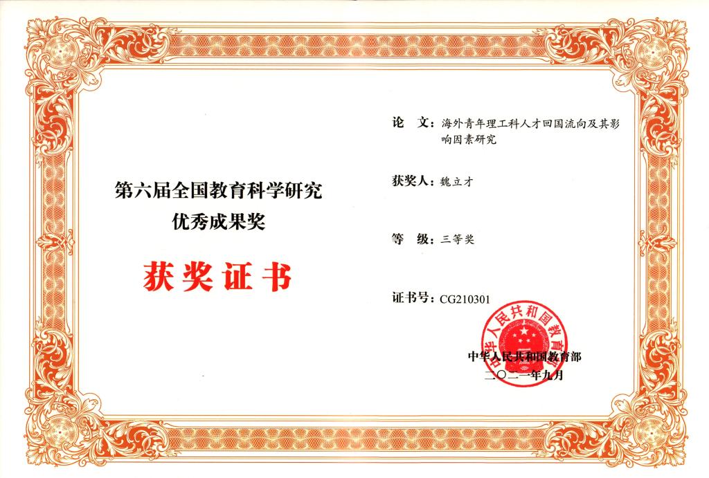 1. 独立完成的研究成果《海外青年理工科人才回国流向及其影响因素研究》(证书编号:CG210301)获得2021年第六届全国教育科学研究优秀成果奖三等奖;