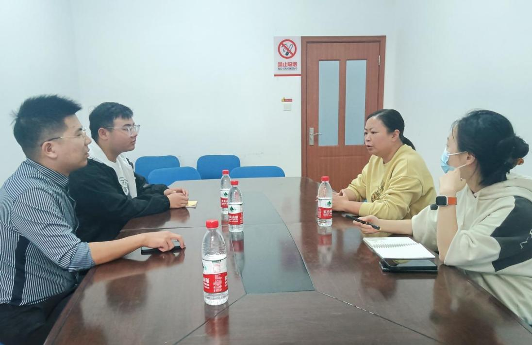 图为团委负责老师谢鹏(左一)同七二二社区副主任沈庆华(右二)交流座谈