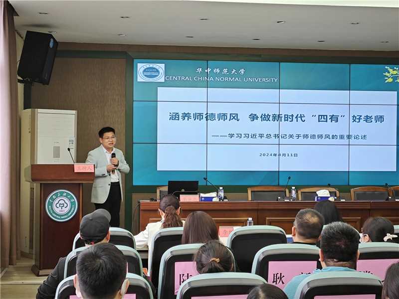 华中师范大学历史文化学院分党委书记李华忠以《涵养师德师风 争做新时代“四有”好老师》为题,分析了当前师德师风建设的形势,详细讲解了新时代党和国家对教师师德师风的要求,以及当前师德师风存在的典型问题。他强调广大教师要遵循教书育人规律、学生成长规律,在“培养什么样的人、如何培养人以及为谁培养人”的问题上旗帜鲜明,做到以德立身、以德立学、以德施教,为培养德智体美劳全面发展的社会主义建设者和接班人作出贡献。
