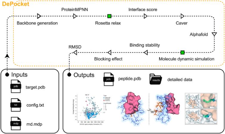 其次,利用物理信息驱动的从头设计策略,从头设计出对黄嘌呤氧化酶(XOR)具有高亲和力的抑制肽。相关论文发表在国际药物化学期刊《European Journal of Medicinal Chemistry》(中科院二区,影响因子:5.9,https://doi.org/10.1016/j.ejmech.2025.118365)上,题为《Accelerated de novo design of xanthine oxidase-inhibitory peptides via physics-informed computational approaches》。该论文融合三级结构基序(TERMs)与ProteinMPNN的计算框架,通过“骨架构建-序列生成-多层筛选-分子动力学验证”的完整流程(DePocket),实现了对酶活性口袋阻断型抑制肽的加速设计,得到了μM级的靶向XOR抑制肽。该成果获得了美国多肽学会(American Peptide Society, APS)在专题推介,在国际肽类药物研发领域产生了一定影响力(https://americanpeptidesociety.org/research/computational-peptide-design/)。