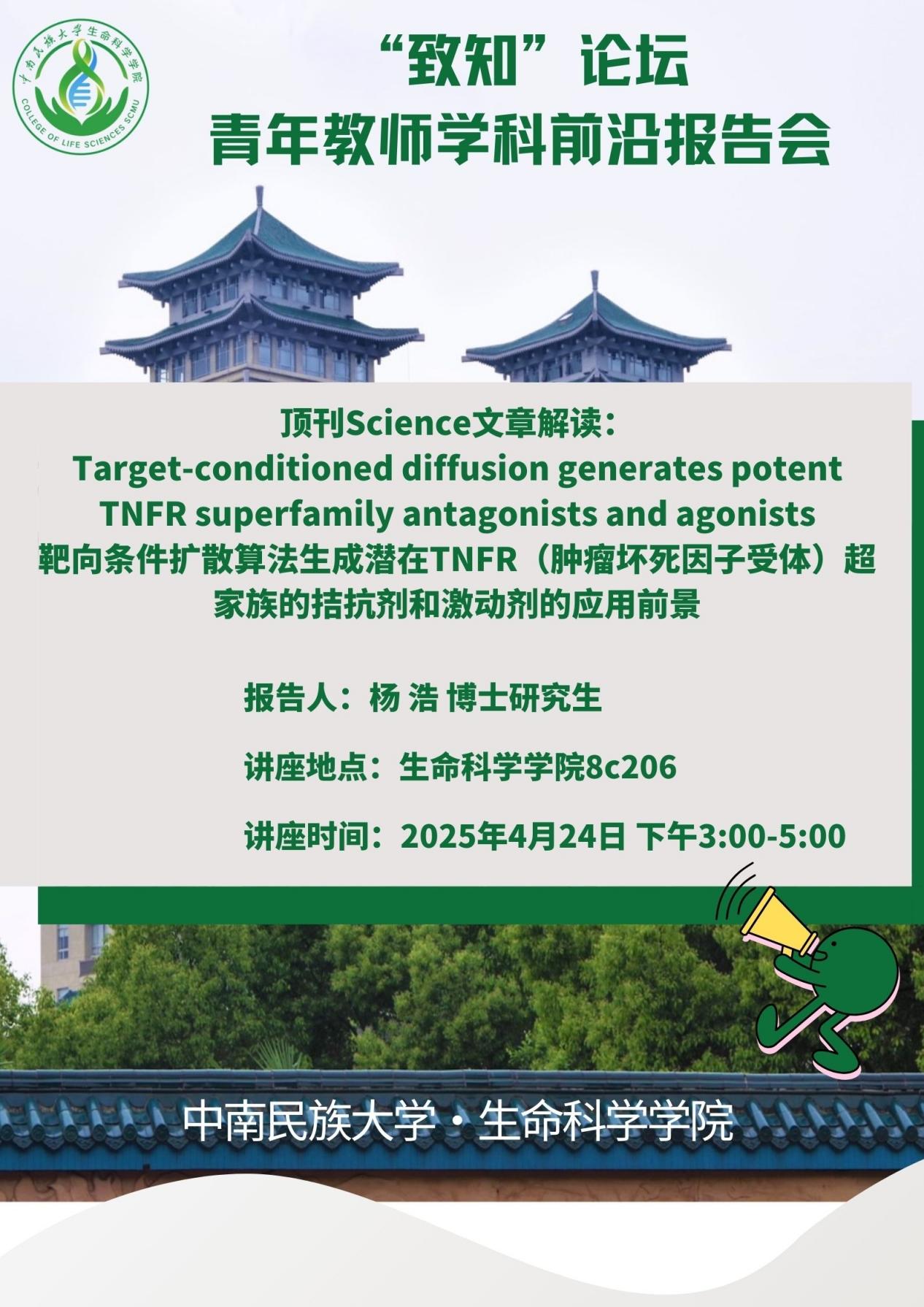 本次报告会于2025年4月24日在学院8C206会议室开展,由威尼斯886699生命科学学院杨浩博士研究生主讲,聚焦顶刊文章,解读“靶向条件扩散算法生成潜在TNFR(肿瘤坏死因子受体)超家族的拮抗剂和激动剂的应用前景”。报告深入剖析算法原理,探讨其TNFR超家族药物研发中突破传统的潜力,为疾病治疗药物开发提供新思路,激发了师生对AI与生物医药交叉领域的研究兴趣。