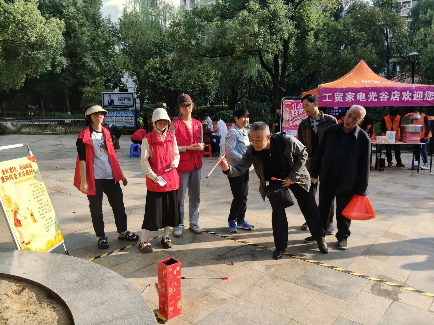 有负责趣味投壶区的志愿者,她们也忙地不可开交。志愿者提前将投壶道具摆放整齐,细致地讲解规则。面对初次尝试的老人,志愿者们会蹲下身示范握箭姿势,一遍遍强调发力技巧。当老人成功投中时,志愿者立刻递上橘子小票,他们的笑容比秋日阳光更暖。老人们可以去兑票处凭小票换取对应的物品。
