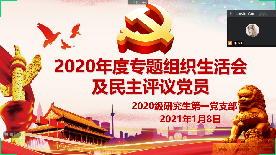 文字作者:杨倩)2021年1月8日12:30,管理学院2020级研究生第一党支部通过腾讯会议平台,开展了2020年度专题组织生活线上会和民主评议会,支部党员全员参会,会议由支部书记陈瑾主持。
