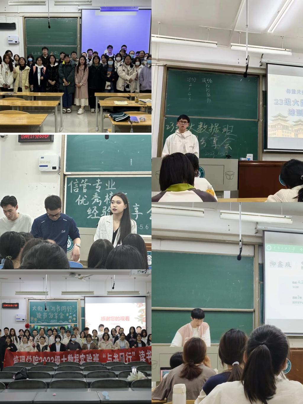 在学风建设方面,为了营造良好的学习氛围,调动组织成员学习的积极性,23级大数据实验班组织了一系列活动:积极召开期中、期末考试动员会,让每一个同学明晰自己的学习目标,鞭策同学们完成好每一门课的学习进度;组织学习经验分享会、保研分享会、综测分享会等,学长学姐们的经验分享让同学们更好地打破大学的信息差,解除进入大学时的种种疑惑与迷茫;组织寒假自主学习打卡活动,班上同学全员参与,在浓郁的学习氛围中,互帮互助、共同进步;开展了“与书同行”的活动,并在春季初圆满完成了读书成果分享大会,为同学们提供了一个展示自己阅读成果和交流心得的平台,为班级营造了良好的阅读氛围,增强了班级凝聚力。在大家的共同努力下,班级学风建设成效显著,2023至2024学年第一学期,23大数据实验班最高绩点在4.3以上,班级中16位同学绩点排名冲进管科大类排名前20。