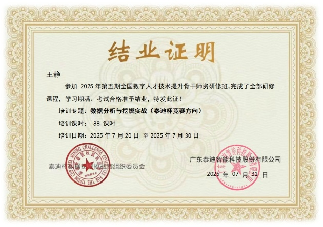 2025年7月20日-30日,商务智能系王静副教授参加了“Python机器学习、数据分析与挖掘实战”高级研修班,并顺利获得结业证书。培训围绕常用机器学习算法、数据可视化以及真实项目案例分析等内容展开,教授了数据分析与建模的核心技能,通过“实战赋能”与“教学相长”相结合的方式,提升了教师的数智化背景下开展商务数据分析与智能决策教学的能力。