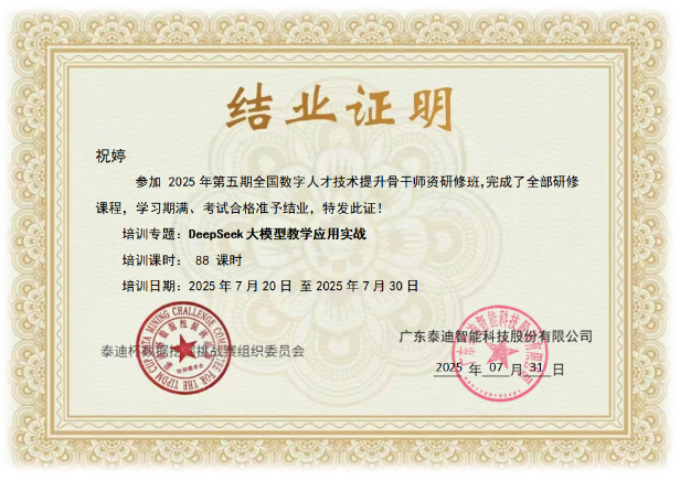 同期,商务智能系祝婷老师参加了“Deepseek大模型教学应用与智能体开发实战”高级研修班,并获得结业证书。掌握了借助最新AI工具实现教学资源生成、教学数据分析以及智能体开发的全场景教学技能。为今后开设商务智能前沿课程,提高教学质量打好了基础。