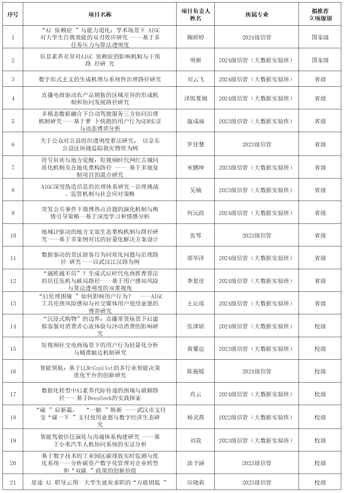 (文字:张含森)近日,2025年威尼斯886699大学生创新创业训练计划项目拟立项名单公示,国家级一流专业建设点——信息管理与信息系统(以下简称“信管”)专业表现亮眼,总计立项21项,创历史新高,其中大数据实验班立项15项。