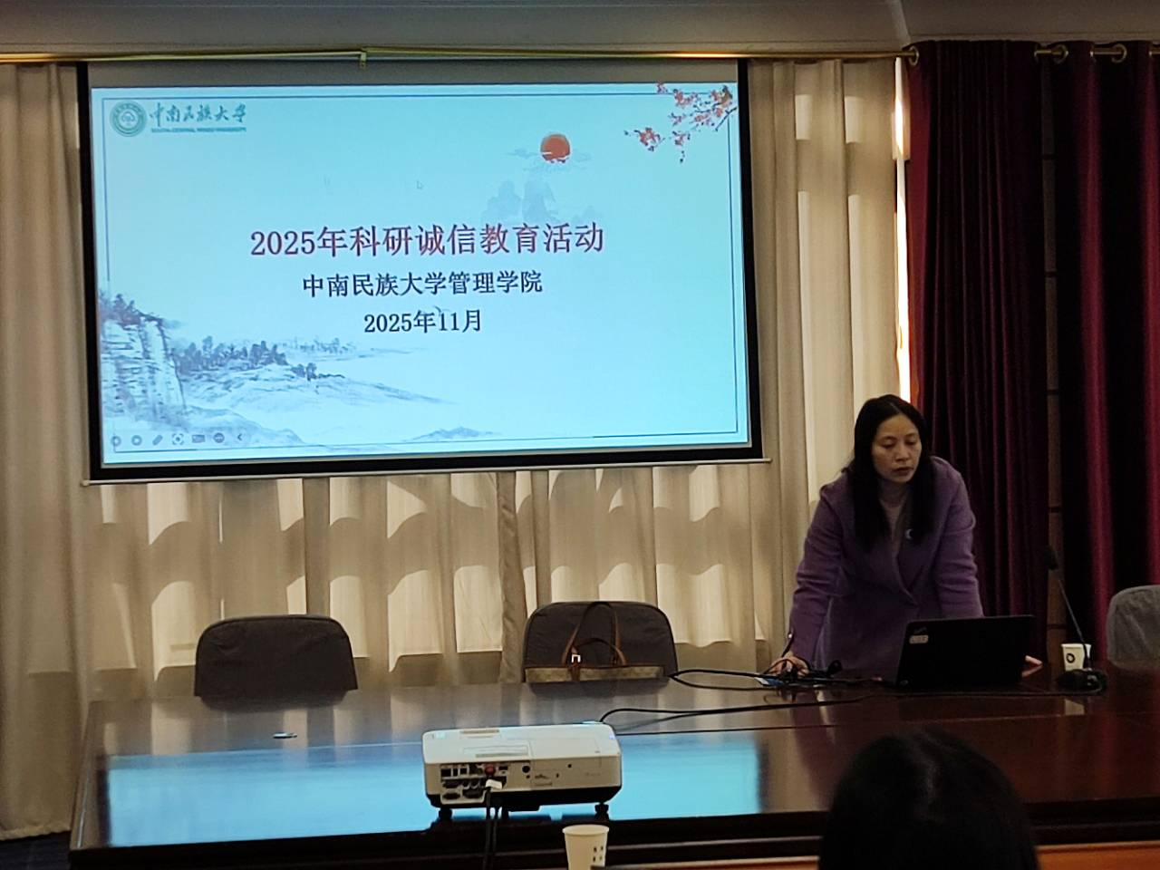 为加强学校科研诚信建设,提升全校科研工作者的科学道德精神,进一步明确学术规范标准,夯实学术规范理念,营造风清气正的学术氛围,促进学校科研工作的健康发展,管理学院于2025年11月20日下午开展科研诚信宣传教育活动。活动围绕“坚守学术初心 弘扬求真精神”这一主题,由副院长周运兰教授主持。