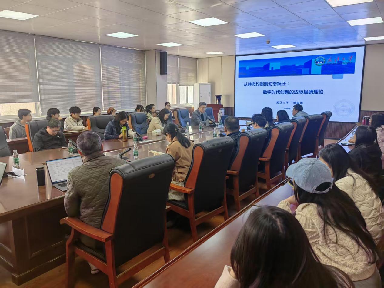 2025年11月27日下午3:00,我院“新文科・新管理・新融合”系列学术讲座第二十四期在管理学院206会议室成功举办。本期讲座特邀武汉大学二级教授、博士生导师范如国莅临,带来题为“从静态均衡到动态跃迁:数字时代的边际报酬理论”的专题分享。讲座由管理学院院长翟华云主持,学院教师、研究生积极参与,现场学术氛围浓厚。