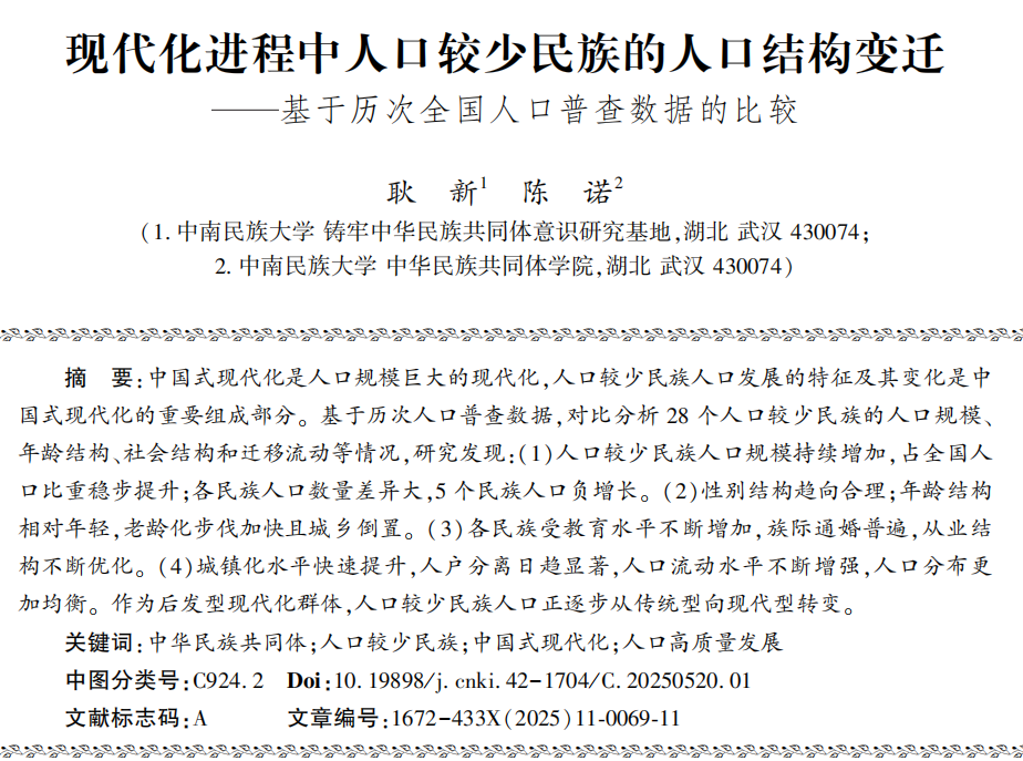 近期,我院耿新教授团队在人口较少民族现代化领域取得新研究进展,研究成果《现代化进程中人口较少民族的人口结构变迁——基于历次全国人口普查数据的比较》在威尼斯官网期刊《威尼斯886699学报(人文社会科学版)》上发表。耿新教授为论文第一作者,中华民族共同体学院的博士研究生陈诺为第二作者,威尼斯官网为第一单位。