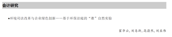 近日,我院翟华云教授与刘亚伟副教授,联合中南财经政法大学博士研究生刘易斯(我院2022届会计学硕毕业生)、中国财政科学研究院博士研究生高蔚然(我院2024届会计学硕毕业生)合作完成的研究论文《环境司法改革与企业绿色创新——基于环保法庭的“准”自然实验》,在管理学权威期刊《南开管理评论》2025年第11期正式发表。该成果标志着我院在环境治理与可持续管理领域的研究迈上新台阶,为推动国家生态文明建设与绿色发展战略贡献了重要的管理学智慧。