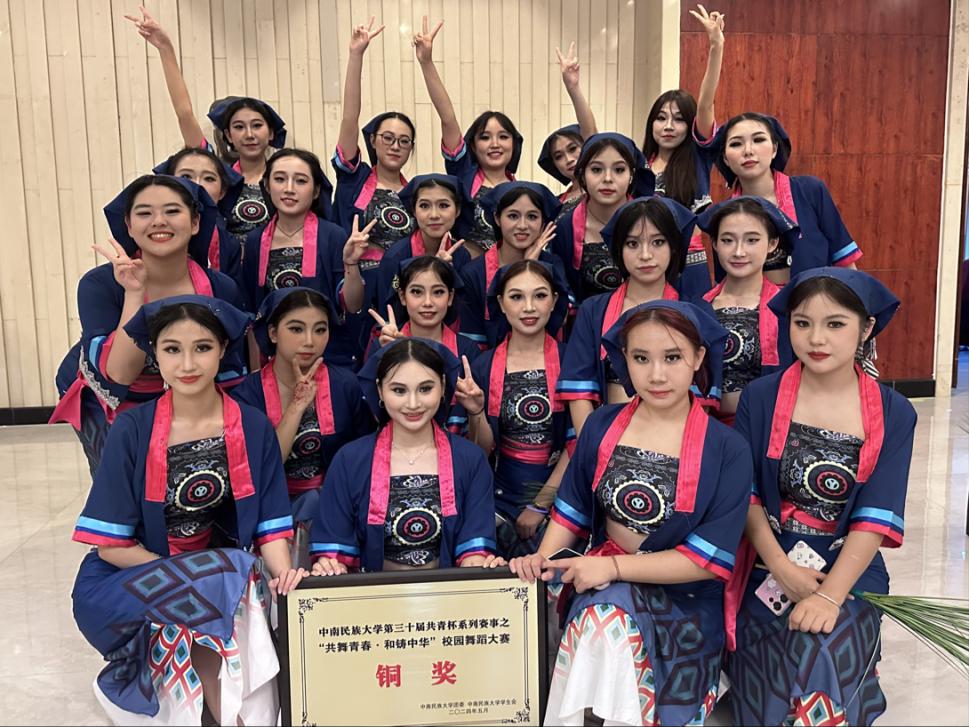 为传承和弘扬中华民族优秀传统文化、传递正能量,管理学院民舞代表队于2024年5月11日参加了在大礼堂举办的中南民族大学“共舞青春•和铸中华”校园舞蹈大赛,并荣获铜奖。