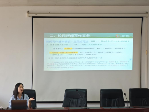 此次培训分为新闻写作培训和新闻摄影培训两部分王卫通过列举新闻稿件实例引出5个“W”和1个“H”在一篇新闻稿中的标题、导语、主体、结尾部分的妙用,深入浅出地讲解了新闻写作目的、新闻要素、校园新闻写作实务三个方面。她表示,写好一篇新闻稿就如同烹饪,“要素”齐全才能色香味俱全。同时,通过不同类型的新闻稿案例展示,引导同学们知悉不同的新闻观察角度、写作切入方式及不同类别稿件写作技巧。