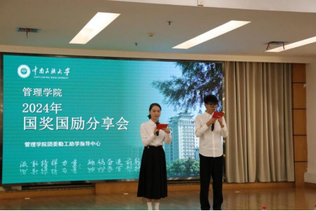 国奖风采展卓越,国励精神鼓人心。11月7日晚,管理学院2023-2024学年国奖国励分享会于润良报告厅顺利举行。学院勤工助学指导中心负责老师曾城皓、2022级辅导员姚亚南、2023级辅导员李丹出席本次大会,学院团委学生会主要负责同学及近200名2024级本科新生参加,会议由文工团主持人金靓琪、马鑫主持。