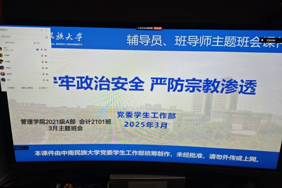 本次班会以“铸牢中华民族共同体意识”为核心,围绕政治安全底线和宗教法律法规政策两大主题展开。同时,班会还融入了全国两会精神的学习和日常人身财产安全教育,突出“预防前置,安全筑基”的教育目标。在校生通过线下形式参与,而大四毕业生则通过线上平台同步进行,确保思想引领与安全教育同频共振。