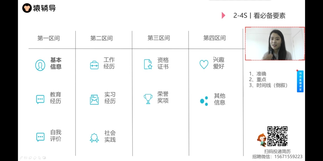 培训课从简历制作目的、简历制作要素、面试官几点建议、猿辅导招聘岗位四方面进行。刘昕提到面试官平均十秒看一份简历,面试官主要看整体视觉、必备要素、工作经历、亮点信息和其他信息,针对这五要素,一一进行了讲解。简历应做到模板清晰,风格统一,必备要素主要包括基本信息、教育经历、实践经历等,工作经历应采用倒叙的方式,同时应加入具体数据,使HR眼前一亮,针对没有很多工作实习经历的同学来说,可通过课程设计、奖学金、发表的作品、参与岗位相关的培训经历等内容来丰富自己的简历,刘昕还通过正反案例来进行指导,加深了同学们的印象。还站在面试官的角度给出了几点建议:简历精简不等于简短,篇幅应控制在一页以内,针对不同岗位必须有所侧重和调整,不能一份简历海投所有岗位,简历要经得起面试官的推敲,一定不要造假。