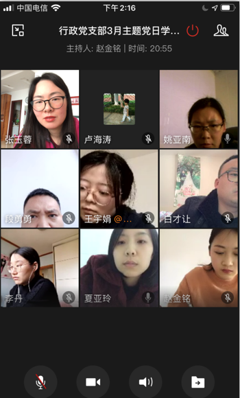 (文字作者:王宇娟)2020年3月23日下午14:00-16:00,管理学院行政党支部积极响应党委组织部下发的《关于开展2020年3月份党支部主题党日活动的通知》,以“大考之中践初心,抗疫一线党旗红”为主题,在周一下午召开了3月份主题党日活动,管理学院行政党支部全体党员参加此次线上会议,会议采用企业微信在线视频会议的形式进行,党支部书记张玉蓉同志主持此次会议。