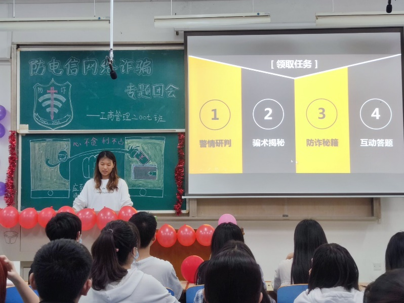 (文字记者:马翔)2021年4月23日,管理学院2020级工商管理类的十二个班级在辅导员卢海涛的指导下开展主题为“提高防范意识,预防电信网络诈骗”班团会,2020级A部各班同学都积极参与了班会并认真学习了“防电诈”的相关知识。