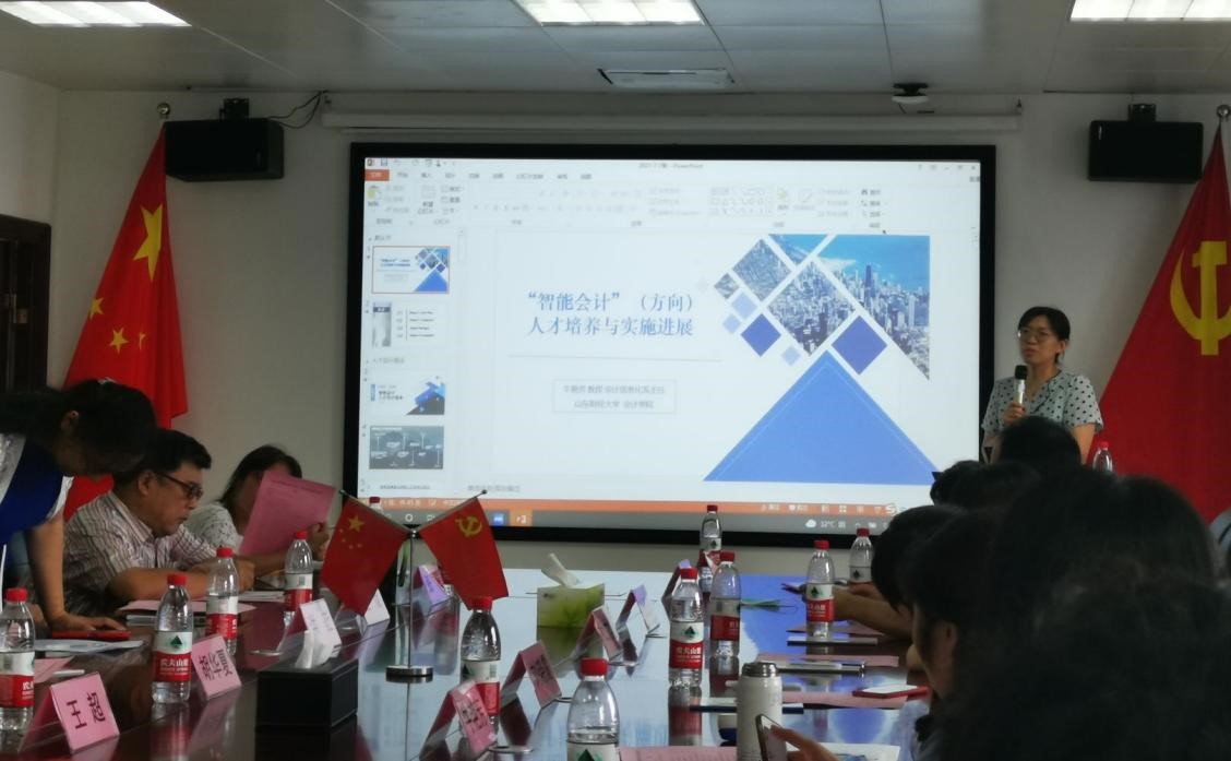 随后,山东财经大学会计学院会计信息化系主任牛艳芳教授围绕“智能财会人才培养改革与创新”展开主题演讲,介绍山东财经大学会计学院在智能财会背景下的专业转型之路。牛教授表示,为满足大数据告诉发展背景下经济社会发展对会计数据分析和会计管理决策的需求,需要突出会计学科知识与智能分析技术的交叉融合,来培养具备会计数据分析能力的智慧型、创新型的应用复合型人才。此外,牛教授还展示了山东财经大学智能会计方向培养方案的设计思路以及课程设置。
