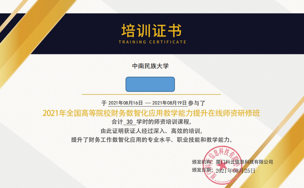 (苏亚民 供稿)为适应财务管理专业数智化转型升级,提升财务数智化应用教学能力,财务管理教研室组织4名青年教师参加由厦门科云信息科技有限公司于8月16日至8月19日举办的2021年全国高等院校财务数智化应用教学能力提升在线师资研修班。