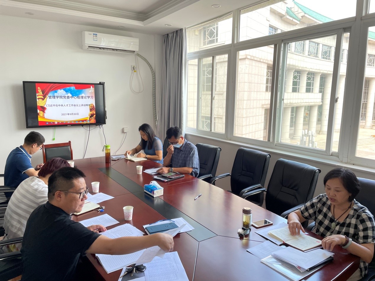 9月30日上午,管理学院召开党委理论学习中心组本学期第2次专题学习会议,集体学习习近平总书记在中央人才工作会议上的重要讲话原文,学院党委理论学习中心组成员参加学习。会议由管理学院党委书记邹反修主持。