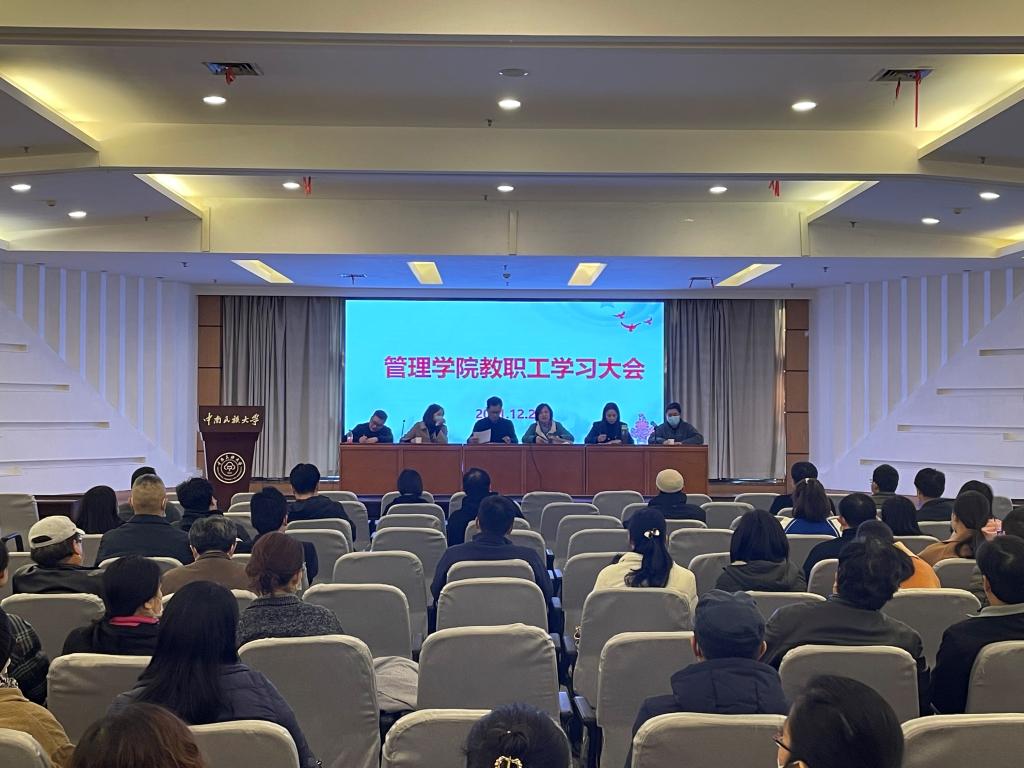 2021年12月3日下午,管理学院召开全体教职工大会深入学习国家民委直属高校工作座谈会会议精神。