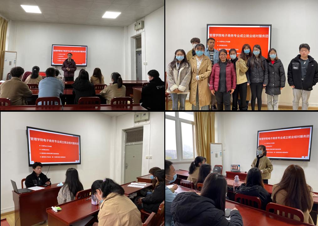 为进一步彻实提升学生就业竞争力,电子商务专业深入开展就业结对服务工作。在前期策划及试运行基础上,电子商务专业于2022年3月25日上午9:00-11:30在管理学院510教室,采用线上线下同步方式举办就业推进会,正式成立并启动就业结对服务团工作,电子商务专业2018级班导师赵宝春和王翠波、教研室主任别黎、2018级全体同学参加会议。会议包括就业形式分析、服务团成员就业经验分享、简历修改与模拟面试三个环节。