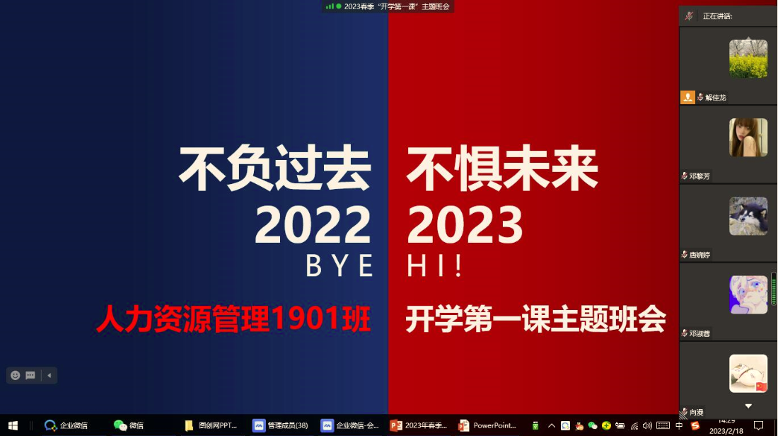 为教育引导学生关注身心健康,自觉遵守校纪校规,防范新冠病毒感染,尽快适应新学期学习生活。根据学校要求,经学院党委部署,2月11日至19日,管理学院辅导员和班导师纷纷通过线上或线下的方式组织召开“开学第一课”主题班会。