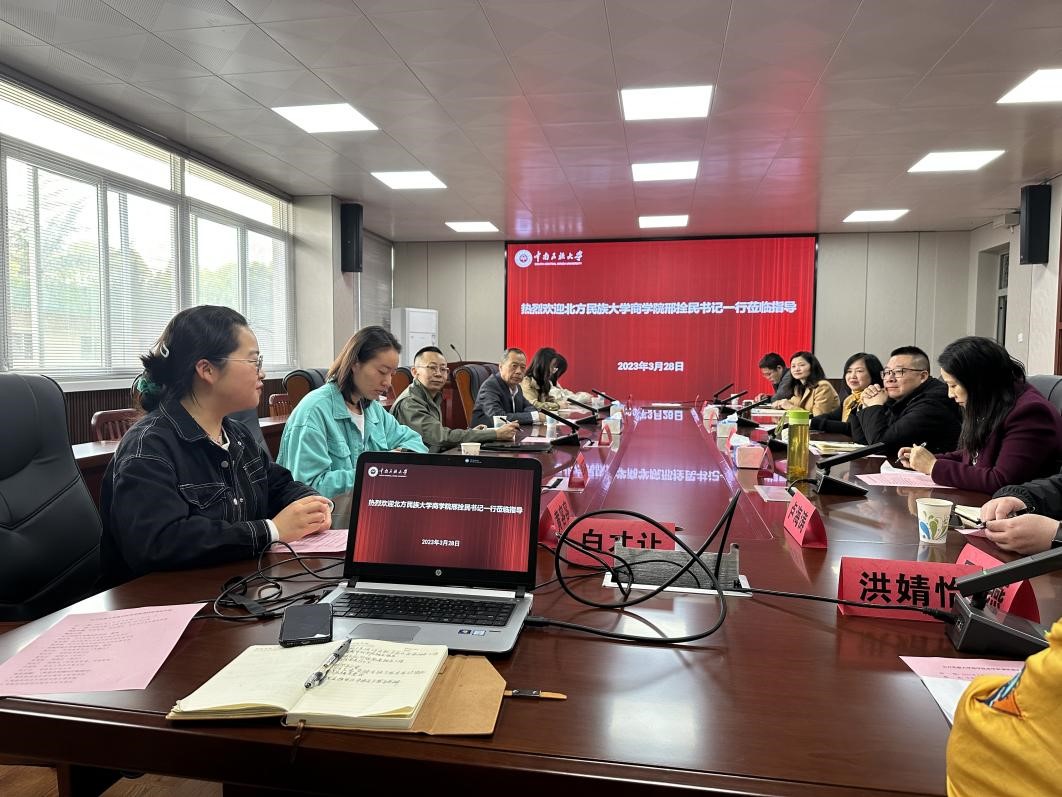 首先,邹反修对北方民族大学商学院各位老师的远道而来表示热烈的欢迎,并就管理学院的党建及专业建设等情况作了介绍。分管本科学生工作的雷长生副书记及分管研究生工作的周运兰副院长从铸牢中华民族共同体意识主线教育、用制度管理规范行为、用学生综合素质测评监督导向、用学生预警帮扶守望相助的“五位一体”工作运行模式和压实班导师、研究生导师的责任等方面分别介绍了管理学院本科生和研究生的工作。