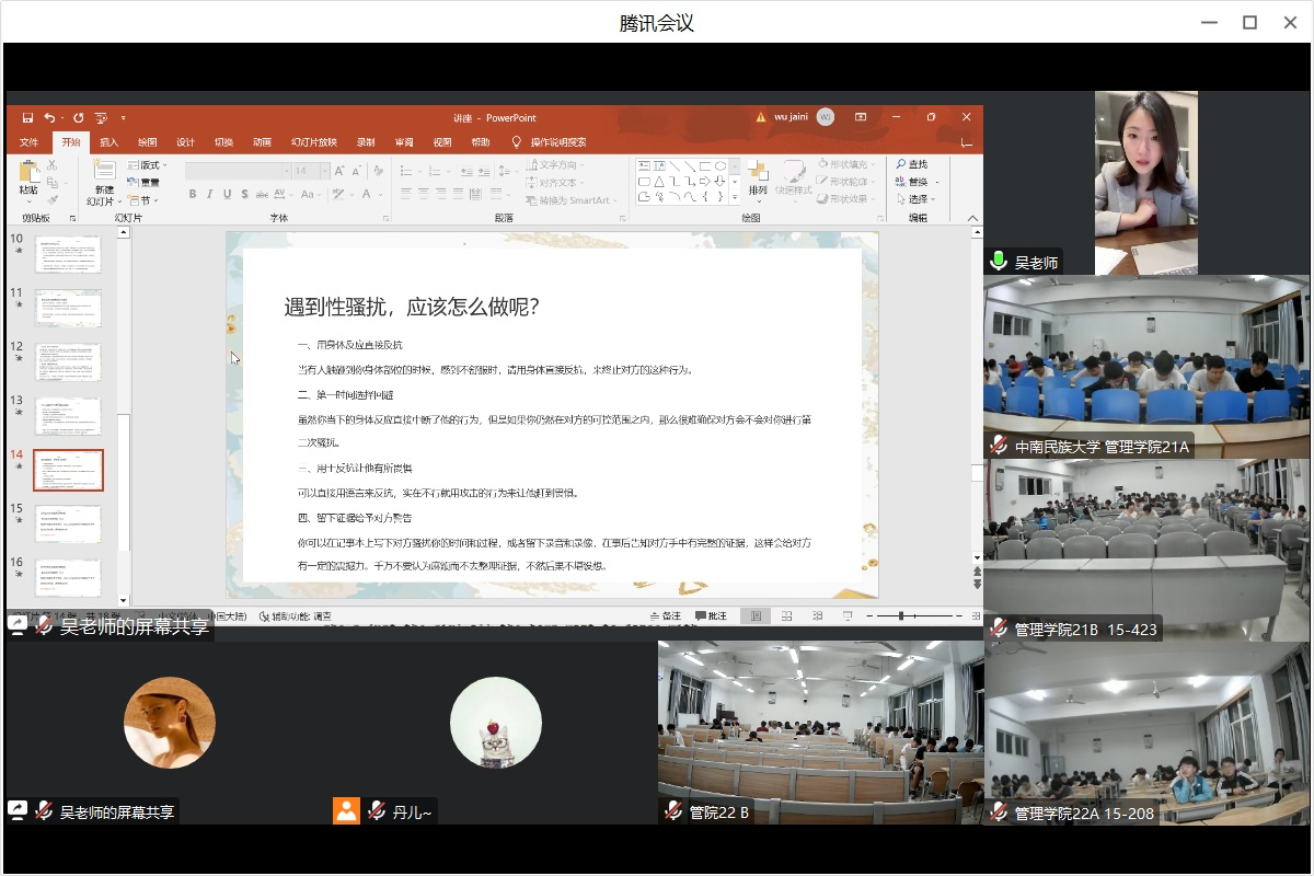 2023年4月16日晚,管理学院举办心理健康活动月之恋爱与性教育专题讲座第二期。讲座邀请了吴佳妮老师主讲,管理学院心理健康工作站副站长李丹老师主持。讲座以“线上+线下”形式进行,有近200名学生在多个教室通过腾讯会议投影形式参与了本次讲座。