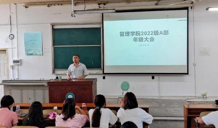 2023年9月14日下午,管理学院2022级A部年级大会在文一楼201召开。本次大会,辅导员曾城皓围绕“防电诈”“校园电动车新规”“增强体质”等多个方面向同学们提出了要求和建议。